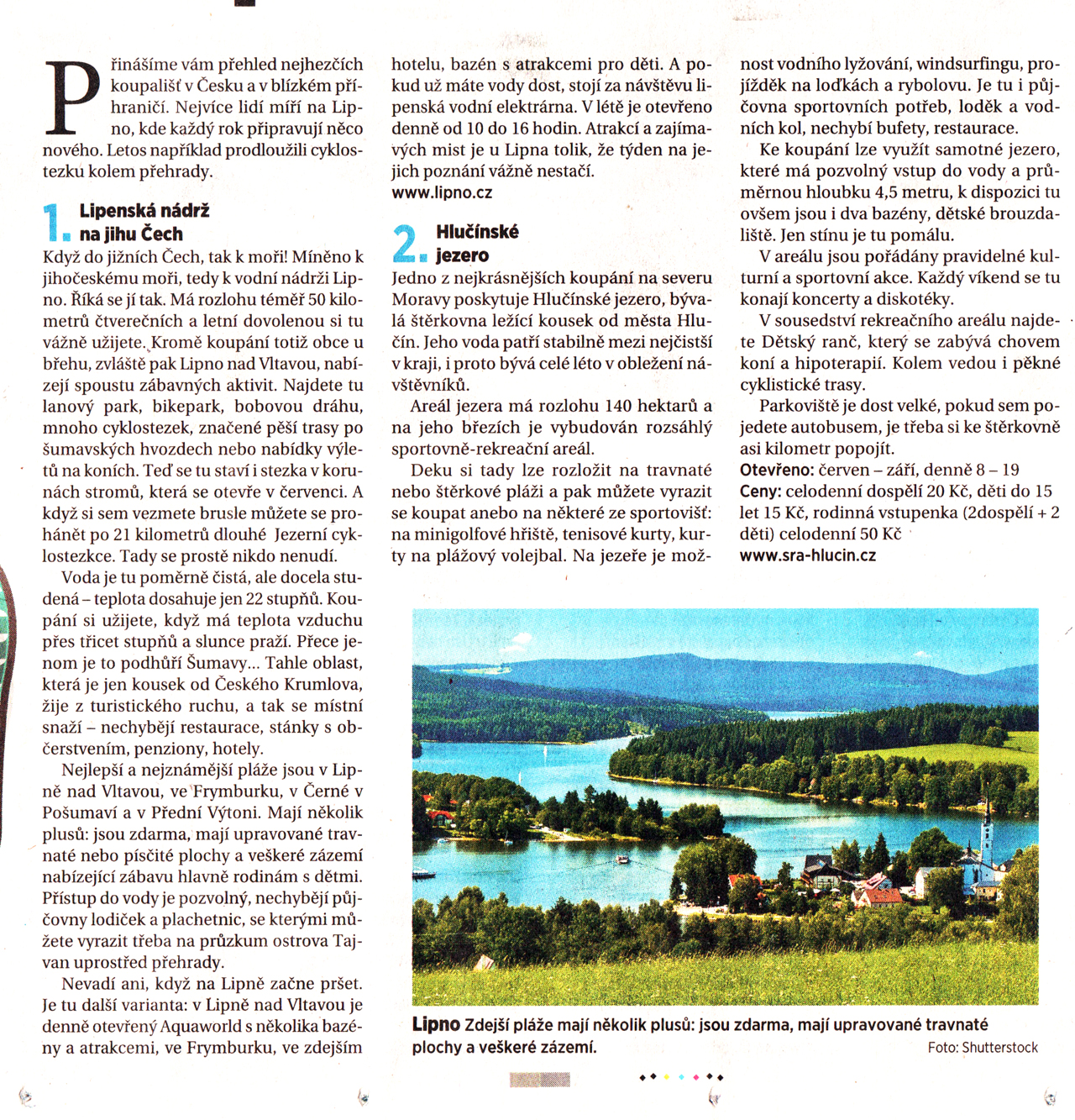 Páteční výdání MF DNES přineslo přehled 50-ti nejhezčích koupališť v Česku a okolí. Celkovým vítězem se u redaktorů Mladé fronty stalo Lipno.