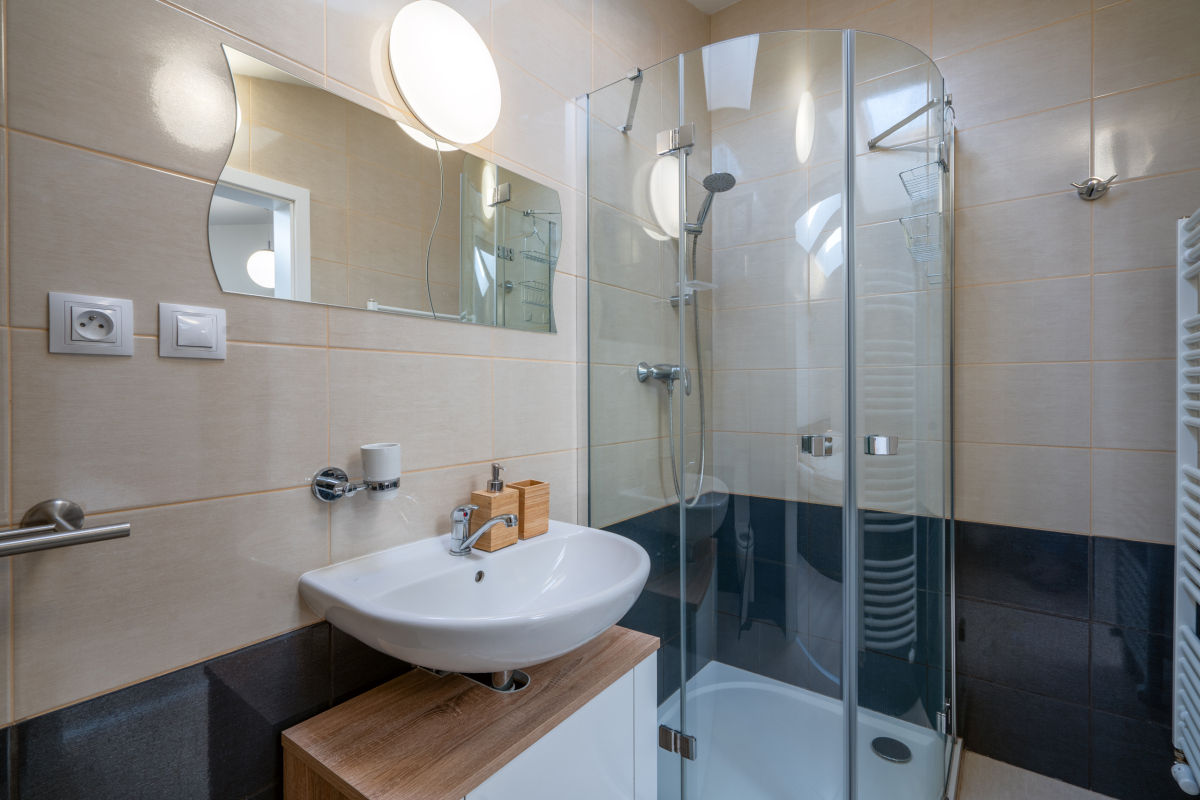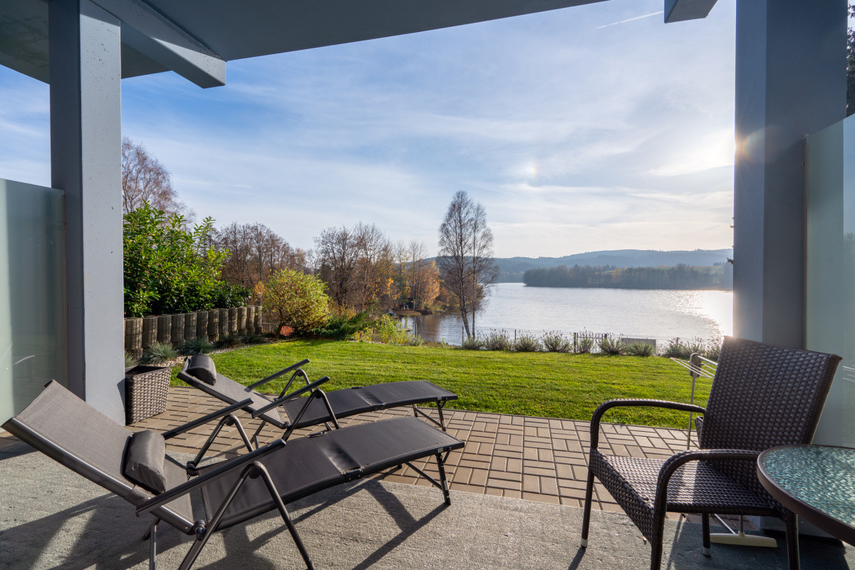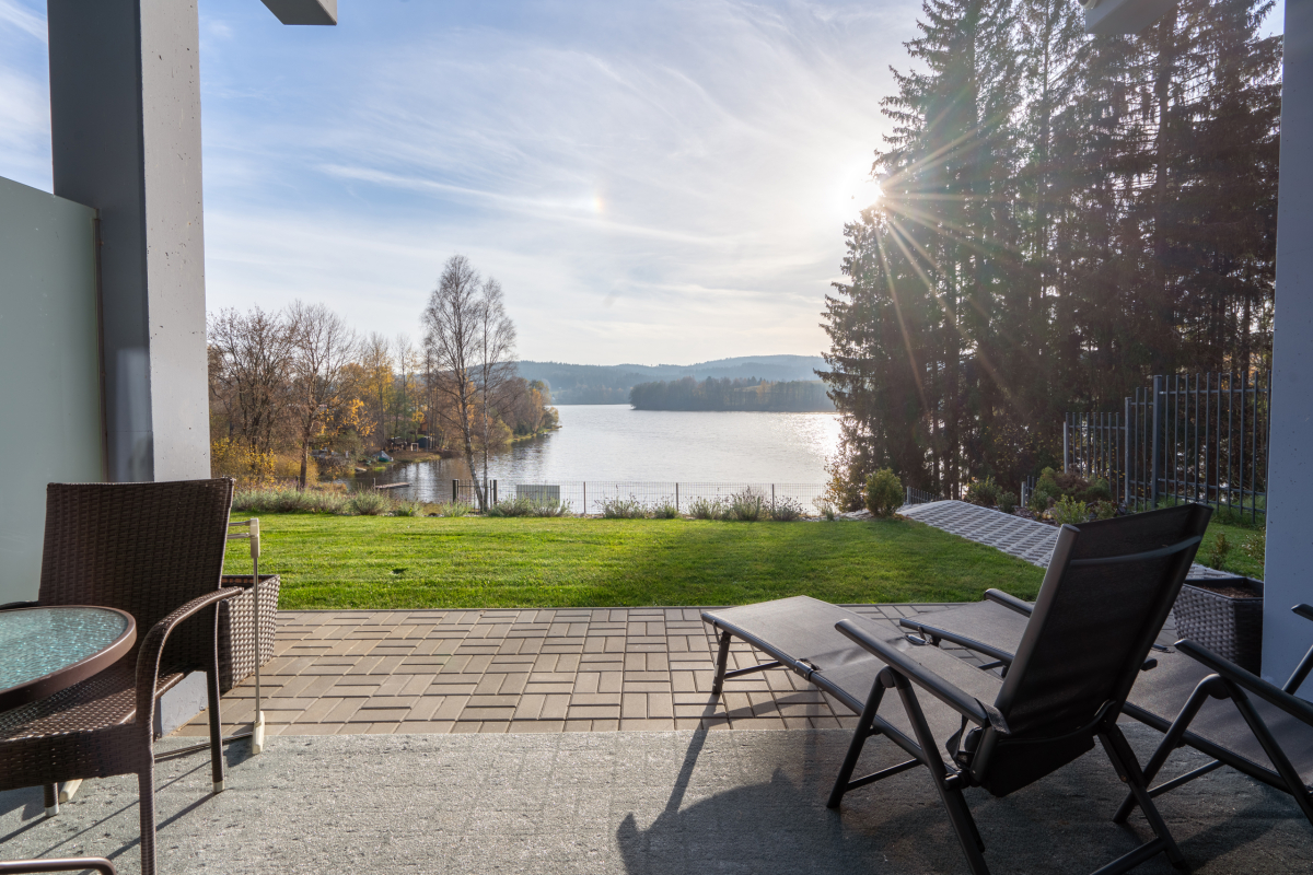 V přízemí nabízíme tři dvojlůžkové pokoje. Každý pokoj má svou soukromou koupelnu, vlastní terasu s příjemným posezením a výhledem přímo na Lipenské jezero. A dále samostatnou místnost pro komfortní a bezpečné uložení lyžařského vybavení s vytápěním na boty a v létě pro úschovu kol.